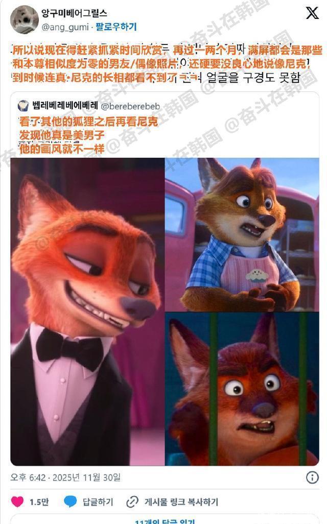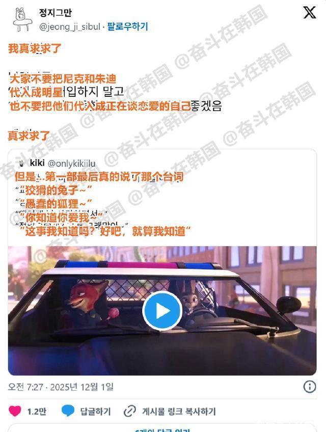 韩国网友评论: 《疯狂动物城2》上映前,就老有某爱豆的粉丝用“长得像”来营销,真心觉得一点都不像,恶心。 明明一点都不像,也不帅,还硬要往上凑,真无语。 不想看划过去就行了,至于骂人吗?你们比艺人粉丝更癫。 烦死了,你男朋友/你本命跟他们长得一点都不像好吗?睁大你的双眼吧! 今天在小群聊里,看到有个男的用“我长得像尼克”来搭讪,所以我深有同感。 真的,爱豆粉丝们老爱给自担贴上“人间某某”的标签,太讨厌了。自娱自乐就算了,在社媒上一搜索全是毫不关心的爱豆,烦死了。 放过尼克朱迪吧,拜托了 搜索自己喜欢的角色,结果出来的全是别人,当然心情不好啦! 人气高才会这样啊,为这点事吵吵嚷嚷很无聊。 如果别人说你喜欢的艺人像谁谁谁,你也会讨厌吧! 如果我是灰姑娘的粉丝,难道就能吼别人“不准随便用灰姑娘”吗?如果我是希腊罗马神话的粉丝,难道就能不许别人夸漂亮时用“像阿芙洛狄忒一样”吗? 可是真有艺人长得像啊!官方也上传了视频让大家挑战,《疯狂动物城》的粉丝们也太矫情了。 要是说后辈爱豆长得像前辈爱豆,就立马“不像啊”、“充其量是低配版”,不要双标啊! 看来拿尼克朱迪比喻自担的真的很多呢,评论区好多被戳到痛处的。 就随他们去吧,不要为了各种事瞎折腾。 超级讨厌,要是把他们自己本命比作还不如他们的人,还说像,估计他们也会气得跳脚吧。 二次元也好,三次元也好,都超级矫情! 真的,搜索的时候很烦人。福宝那时候也是,看到一个胖胖的棒球选手就叫人家福宝,神经病。 在那些说“长得像尼克朱迪”的人里,我就没见过真正像的,除非是真狐狸和真兔子。 可能因为我不是爱豆粉吧,觉得不像,而且原作可爱多了,讨厌硬往上蹭。 还说什么也是帮《疯狂动物城》宣传,《疯狂动物城》需要宣传吗? 尼克朱迪不是比那些利用他们的爱豆有名多了吗?说什么帮忙宣传。